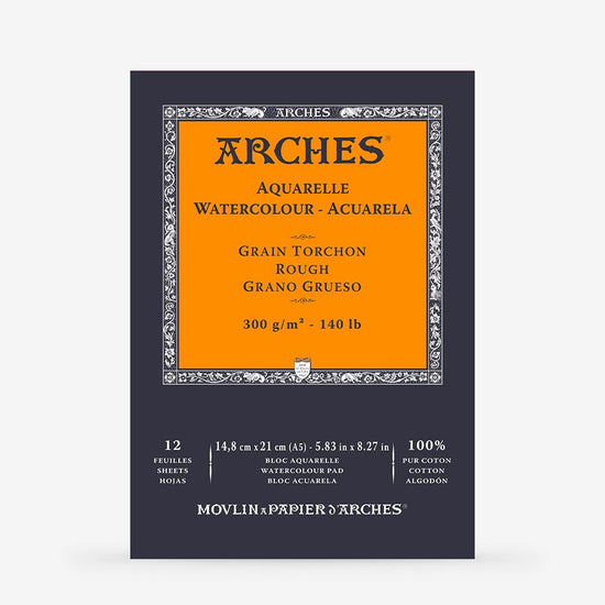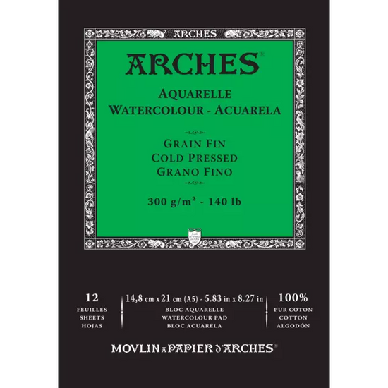 Arches Aquarelle range is a prized watercolour paper made on a cylinder mold. Its 100 % long cotton fibre composition gives the paper its beauty, a natural, lasting whiteness and touch as well as strength.