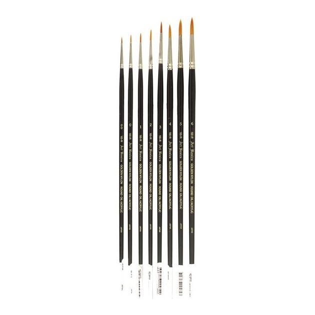 Made from golden nylon, these brushes have great colour carrying capacity and spring. Of great durability they are a well moulded, quality brush, allowing for sensitivity in mark making. Similar to the Art Basics 665R, this long handled brush is designed for use with oils and acrylics. Ideal for painting long scrolling, straight lines or stroke work. Long handle.