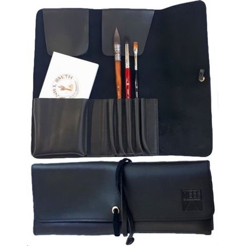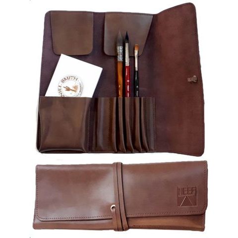 Soft 100% leather brush wrap perfect for watercolour brushes and a small palette box. Brown leather.
