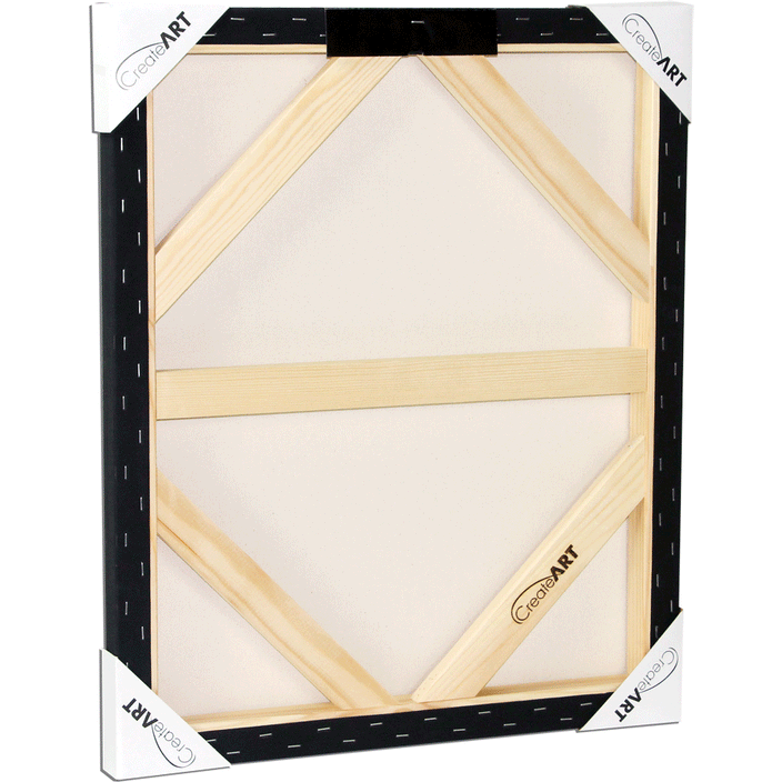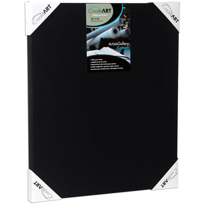 CreateART Artists Gallery Black Primed Cotton 450gsm unbleached cotton duck canvas. This superior product features corner and center bracing and a milled 35mmx35mm rounded edge heavy duty pine stretcher bar. A quality gallery accepted canvas, for use by the professional artist.