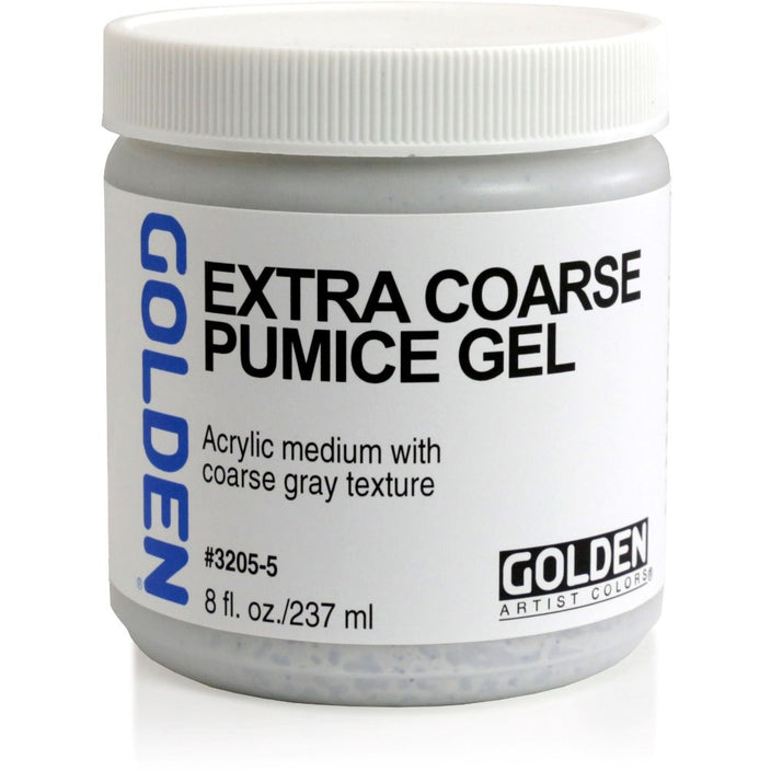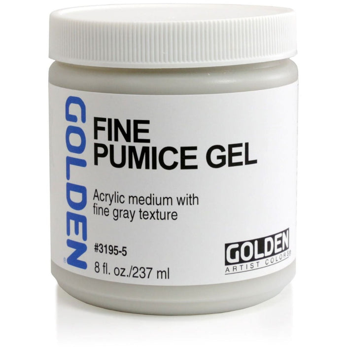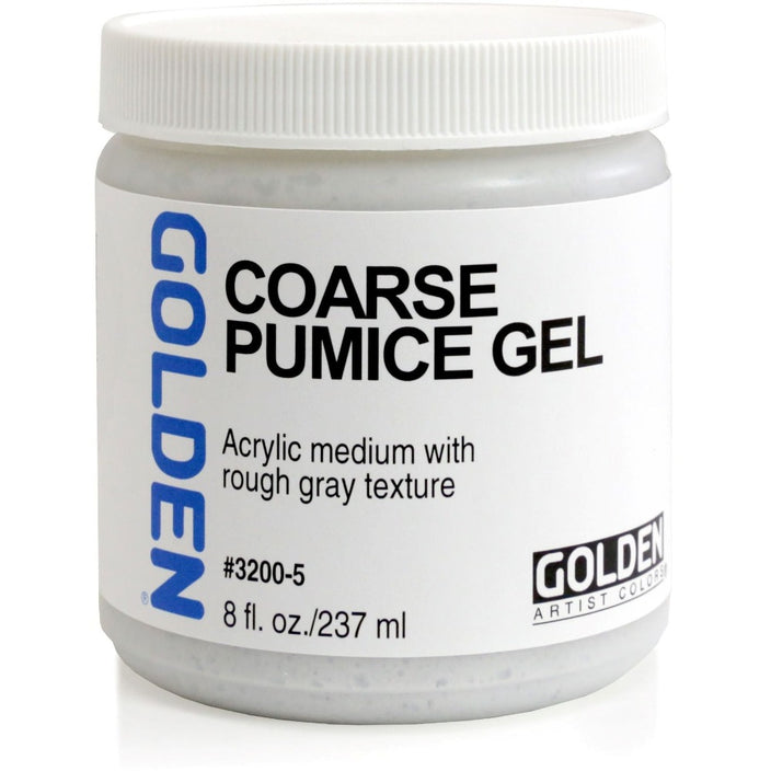 Pumice Gels textures dry to hard films. They mix well with GOLDEN Acrylic Colours. Fine Pumice Gel is useful as a drawing ground. Coarse Pumice Gel and Extra Coarse Pumice Gel create more coarse textures to yield concrete-like finishes