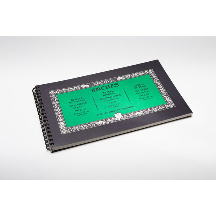 The Arches Aquarelle range now includes a new generation travel journal sketchbook. Arches Aquarelle is 100% cotton rag paper, 300 gsm cold pressed, natural white, format 15 x 25 cm. 15 sheets. Pulp-dyed black card cover and back board provides rigidity for more comfortable working. Very high quality, can also be used as a medium for creating mixed media work. Metal spiral binding on the short side. Protective cover on the back also supplied wrapped in recyclable plastic film.