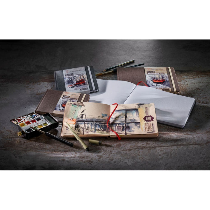 Hahnemühle’s Toned Watercolour Book contains 60 pages of finest watercolour paper. The 200 gsm watercolour paper has a fine grain surface on the front and backside. The solid linen cover protects the contents from moisture and dirt. Grey or Beige.