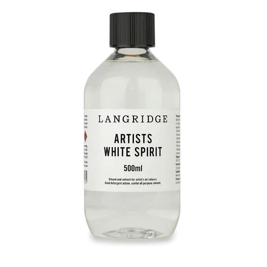 Langridge Artists’ White Spirit may be added to oil colours, drying oils and compatible oil mediums in small quantities, used to dissolve and dilute artists’ synthetic varnish and for the cleaning of brushes and painting equipment.