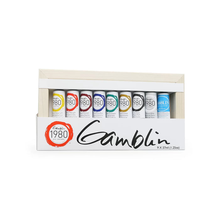 Gamblin 1980 Oil Colours are handcrafted in small batches. They are a top value student grade oil paint. This wooden box contains nine 37ml tubes and a solvent free gel medium.