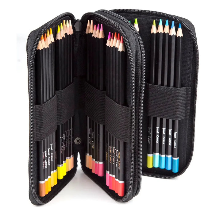 It contains 2 separate compartments which each hold 24 pencils and includes zippers on each side which snap close for extra security during transportation.