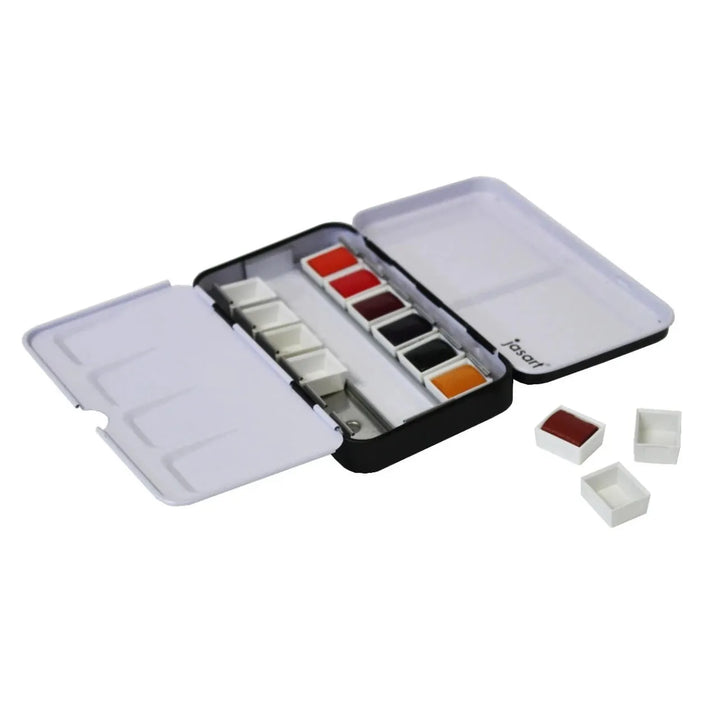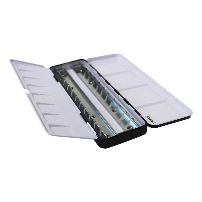 Empty metal palette boxes. Strudy, re-usable and feature a black enamel exterior and white enamel interior with fold out palette wells.