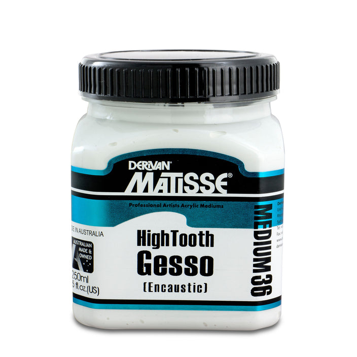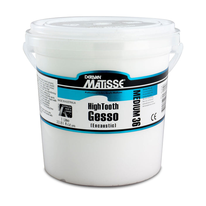is a permanent, flexible water-based ground, with a high tooth finish, for canvas, board, wood panels or paper. High Tooth Gesso dries to a bright white, matte surface that provides much more "bite" and absorbency than a standard gesso, making it a recommended ground for encaustic work or as a soft and oil pastel primer.