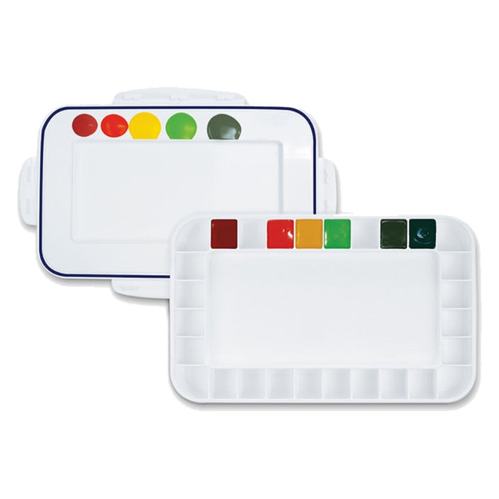 Mijello airtight 28 well palette is leak proof and airtight. Keeps colours fresh for weeks. The lid provides extra mixing space. Special surface coating allows dried acrylics to peel off easily. Suitable for acrylics, oils or watercolours.