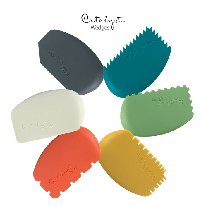 Catalyst Wedges are ergonomically designed to fit in your hand allowing a direct interaction with your work. Designed for use with heavy-bodied paints, Catalyst is at home with oils, acrylics, and water-miscible oils. Because they are heat-resistant, they excel with encaustics. Artists are using them with plaster, clay, and even frosting. Made of FDA-approved silicone, Catalyst Blades and Wedges are great for food crafting. The silicone is easy to wipe clean and is solvent resistant. Clean up in most cases can be done with mild soap and water. Dried paint can be peeled off the silicone surface.