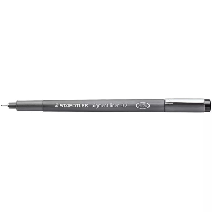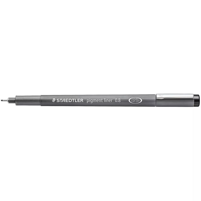 Black fineliner for writing, sketching and drawing. Pigment ink, indelible, lightfast and waterproof on paper. Long metal tip, ideal for use with rulers and templates. Can be left uncapped for at least 12 hours without drying.