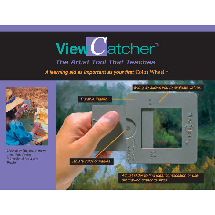 The ViewCatcher™ is an artist's view finder created to be a composition or cropping tool for artists or photographers. It can be used for still life drawing or painting, plein air painting, figures and landscapes. Used to establish horizontal or vertical orientation and locate the horizon. View your subject matter and your artwork so you can make better decisions about composition, value judgment and true colour. Pocket size.